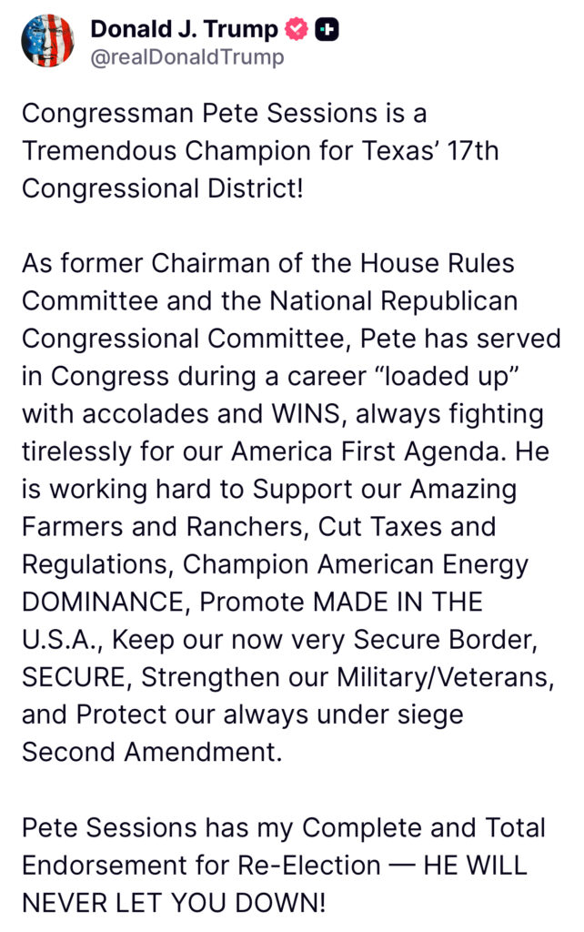 BREAKING: President Donald J. Trump Endorses Congressman Pete Sessions for Re-Election