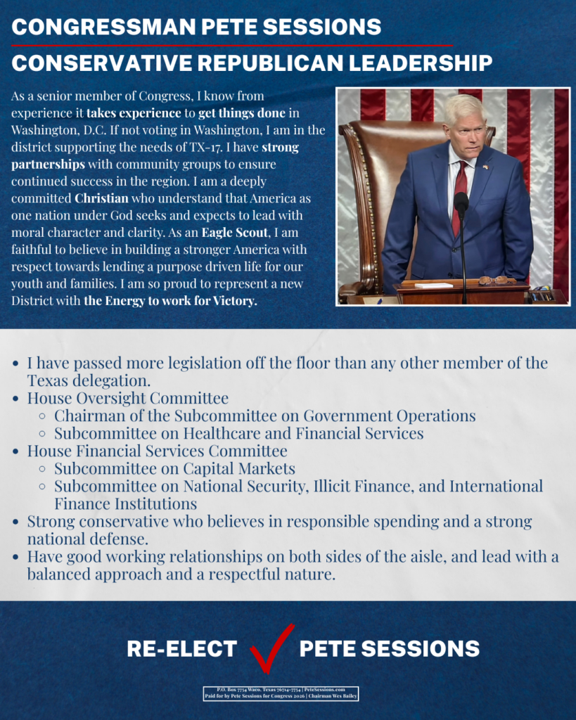 TX-17! It’s Election Day for the 2026 Midterm Primaries. Polls are open from 7AM-7PM. Get out and vote for our great conservative leaders who will make our nation great! Pete Sessions has a proven track record of getting things done and will always fight for the conservative values of TX-17.